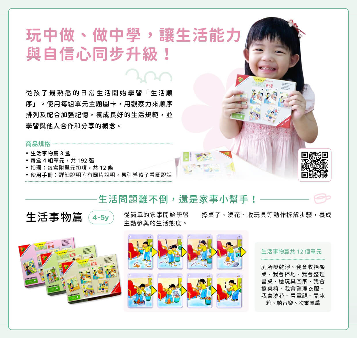 教具說明:這些單元都是孩子在日常生活中最常接觸到的活動,例如:掃地、擦桌子、收拾玩具。藉著看圖卡說故事、排圖卡順序,讓孩子增進語文表達能力、加強記憶力及觀察力、培養邏輯推理能力以及養成良好的生活規範和學習獨立的態度。