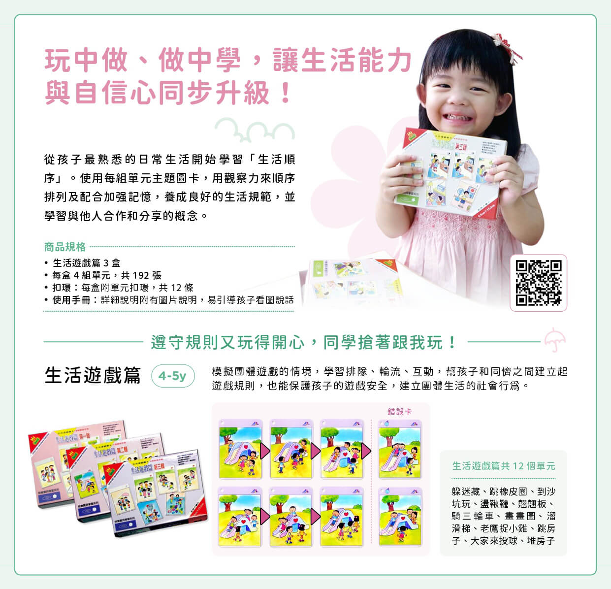 教具說明:這些單元都是孩子常玩、從以前就有的遊戲,如:躲迷藏、溜滑梯、老鷹捉小雞。藉著看圖卡說故事、排圖卡順序,讓孩子增進語文表達能力、加強記憶力及觀察力、培養邏輯推理能力以及養成與他人合作、輪流和分亨的概念。