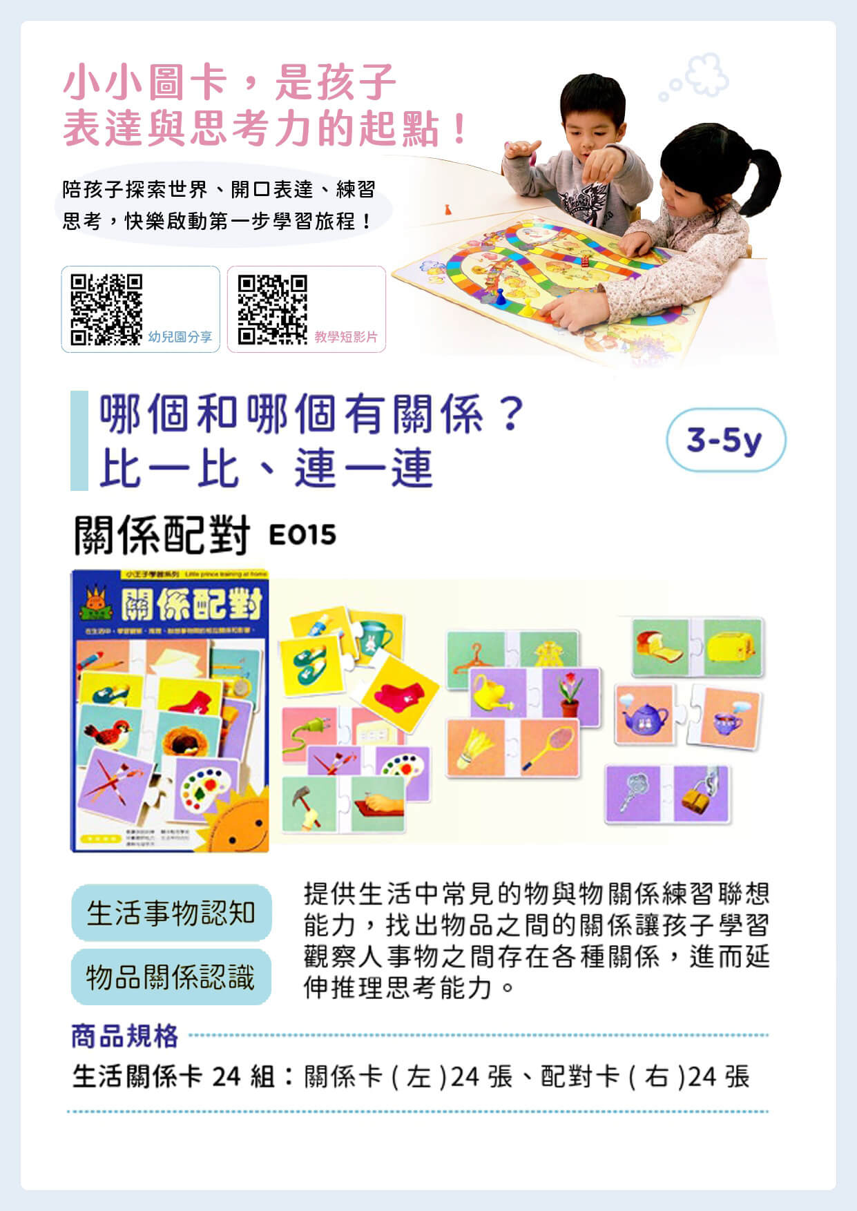 教具說明:以配對、拼揍操作方式協助孩子學習充滿「關係」的生活。生活中的人、事、物之間互有關連,「關係」可以簡單,也可以複雜,而且是很有趣的。本教具提供24組生活常見的物與物關係,讓孩子熟悉所謂「關係」的概念,進而可延伸、推理、聯想更多關係的認知。