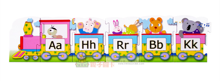 這一套火車英文拼圖從認識ABC開始,讓孩子認識英文字母藉遊戲在沒壓力、非常快樂的學習英文,並可以從A~Z練習拼音。