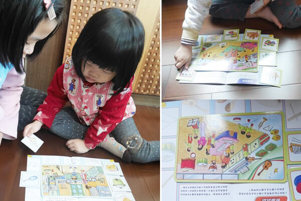 每組都是一種貼近孩子的生活情境主題:房間裡、客廳裡、廚房裡和浴室裡,並了解語詞與單位詞關係的用法。
