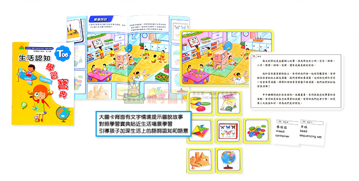 共2輯,每輯各包含四組貼近孩子的生活場景「每組各一張大場景圖卡」與「9張物品圖卡」和「各1本學習寶典」(圖卡和書相互配合)。