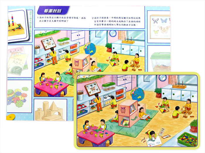 書+大圖卡:陪同孩子「看圖說話」,請孩子說說看,教室圖卡和學校的教室有什麽不一樣的地方或物品?在談話的過程中請適時加入單位詞與孩子互動。