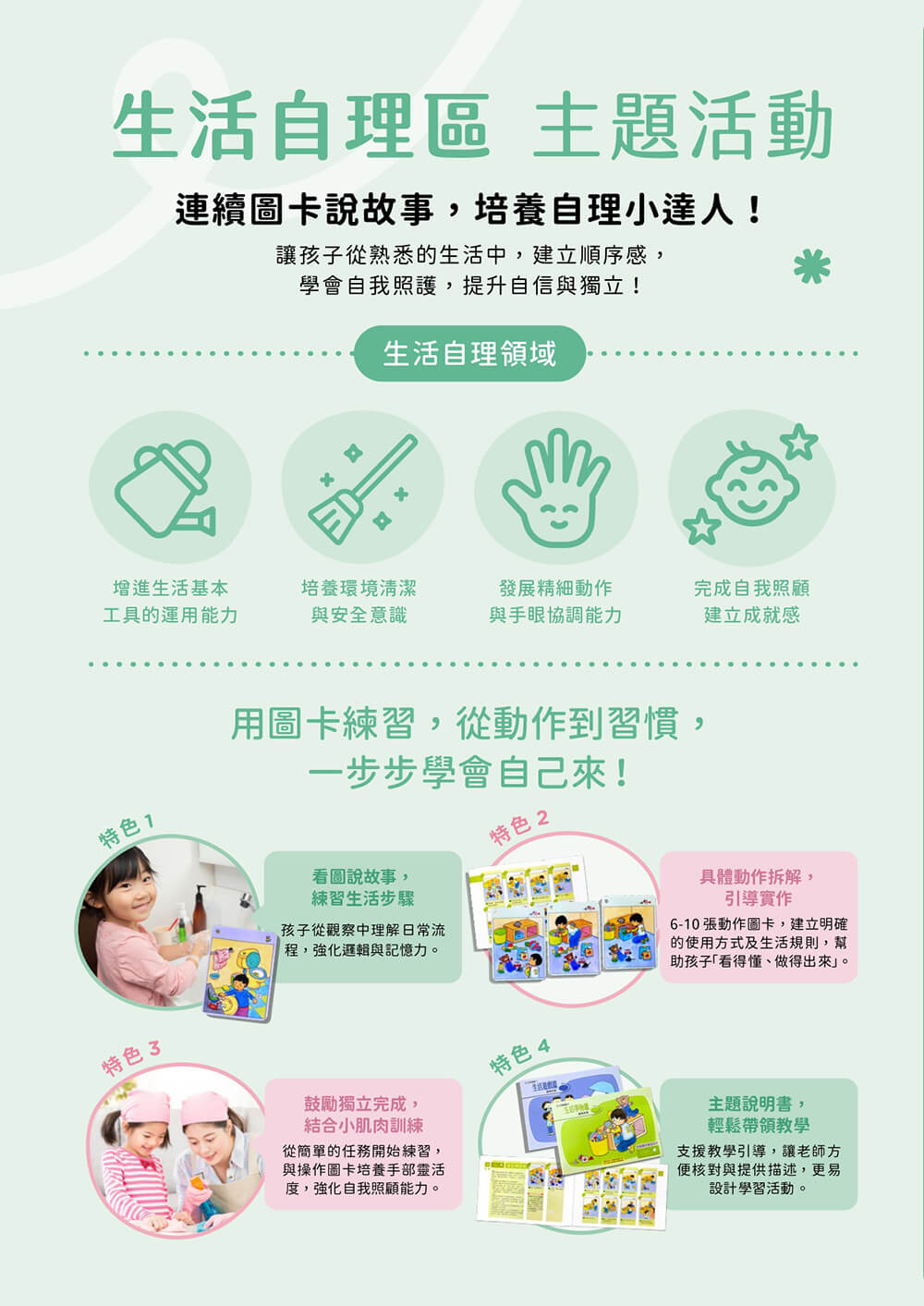 教具說明:這些單元都是孩子在日常生活中最常接觸到的活動,例如:掃地、擦桌子、收拾玩具。藉著看圖卡說故事、排圖卡順序,讓孩子增進語文表達能力、加強記憶力及觀察力、培養邏輯推理能力以及養成良好的生活規範和學習獨立的態度。