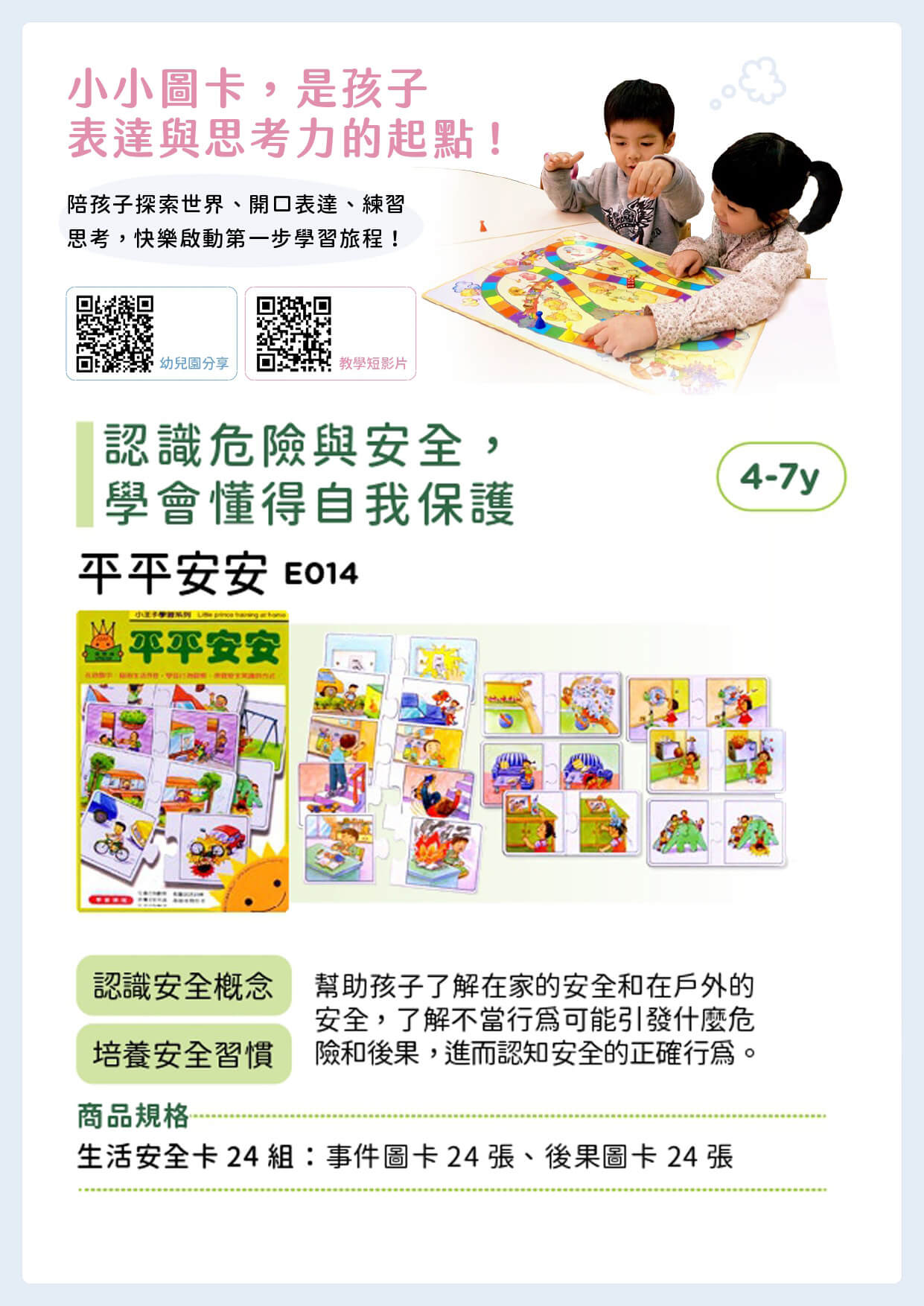 教具說明:以因、果配對操作方式協助孩子學習「生活中的安全常識」。孩子的好奇心,是學習的原動力,在學習過程中,不一定具備足以保護自己的安全常識,以致於可能發生危險、受傷,甚至影響到生命。這套生活圖卡「安全篇」正可以幫助孩子去了解什麼不當行為,將可能引發什麼後果,進而認知正確行為安全與重要性。記得;孩子的「安全教育」是要學習的,這是父母的責任。