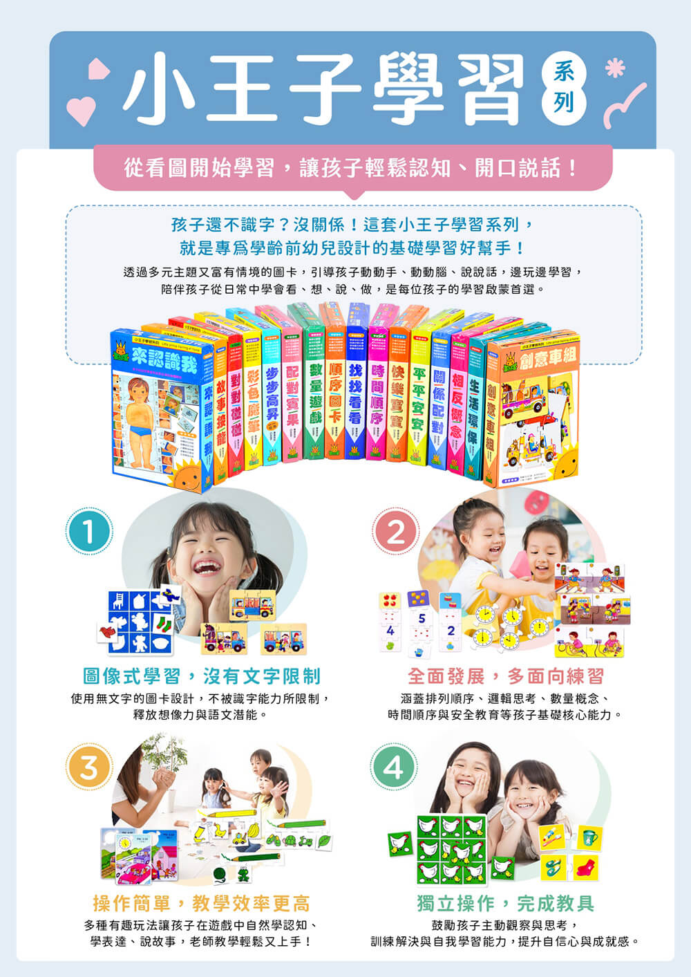 教具說明:以配對、拼揍操作方式協助孩子學習充滿「關係」的生活。生活中的人、事、物之間互有關連,「關係」可以簡單,也可以複雜,而且是很有趣的。本教具提供24組生活常見的物與物關係,讓孩子熟悉所謂「關係」的概念,進而可延伸、推理、聯想更多關係的認知。